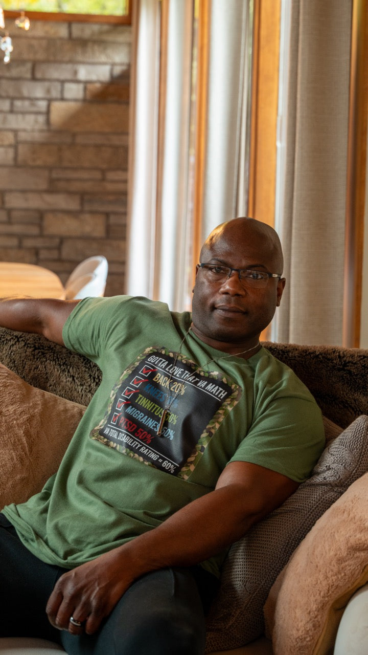 This T-shirt features a distinctive, humorous graphic about the veteran disability rating process, stating: "Gotta Love That VA Math." This comfortable, unisex shirt is made from a super soft polyester blend with added stretch, utilizing moisture-wicking and abrasion-resistant technology for durability.